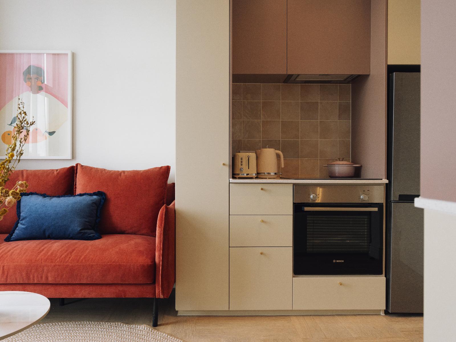Accommodation comprises various comfortably decorated hotel rooms and suites. Each option features an en-suite bathroom fitted with a shower. Each room or suite offers a sitting area and a well-equipped kitchen, should guests want to prepare their meals. In addition, each option contains air-conditioning, free Wi-Fi access, a TV for media entertainment, and other amenities for convenience.