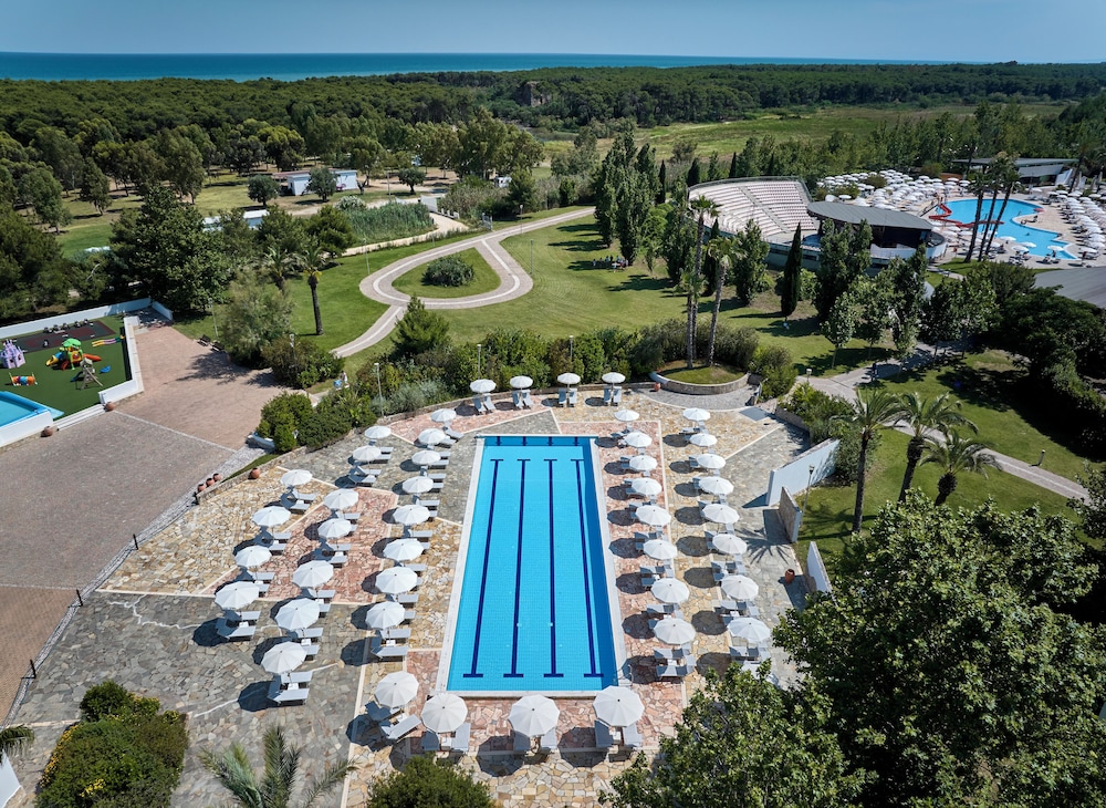 Torreserena Village is a 4-star Hotel-Village. It is located in Marina di Ginosa (Taranto), on the beautiful wide beach of the Ionian Coast, which has been awarded with a Blue Flag for 20 years thanks to the quality of its sea and sandy beaches. It is located at 110 km from Bari and Brindisi airport, 30 km from Matera and 65 km from Alberobello and Valle d'Itria. Torreserena Village meets the adult and children needs and desires for an enjoyable vacation dedicated to fun and relaxation. A beautiful, shaded pine-wood joins Torreserena Village to the sandy beach, which is at about 700m from the rooms. The hotel has 400 rooms located in two-storey buildings all of which are equipped with all comforts. The private and well-equipped beach is connected at the village by a free shuttle (not equipped with ramps for wheelchairs and pushchairs) and offers beach umbrellas, sun-beds, deck-chairs,