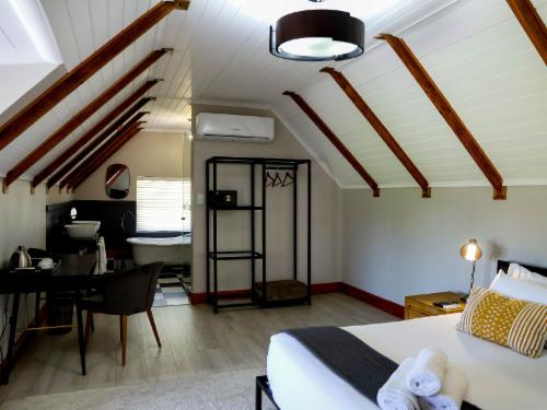 Uitsig is a Boutique Hotel and Conference Venue that celebrates the rich history of the Goldfields while a contemporary interior combined with Cape Dutch architecture creates a unique atmosphere. Air-conditioned, en-suite bathrooms with either or a bath and shower or shower only, 43" flat-screen TV with Hotel DStv Bouquet, Telephone, Coffee Station, Desk & a Safe in most of the rooms.