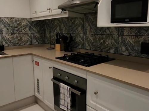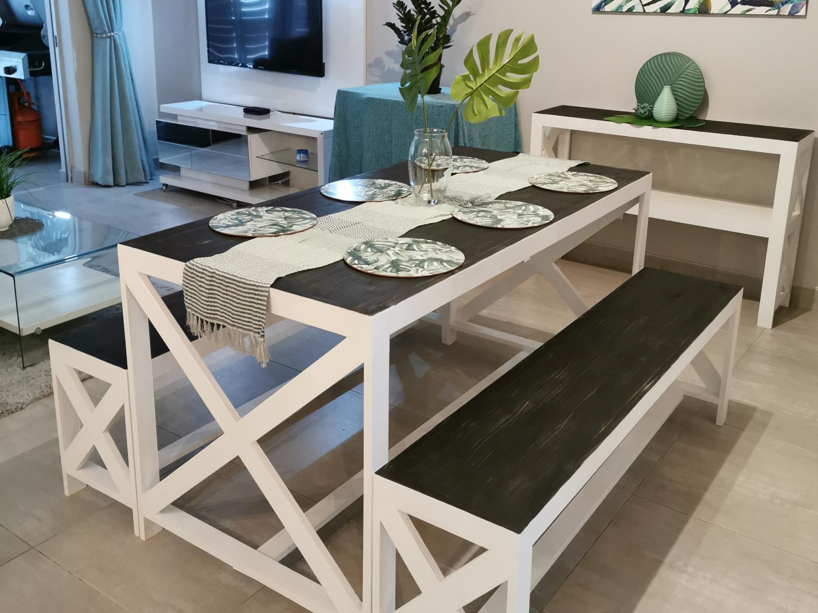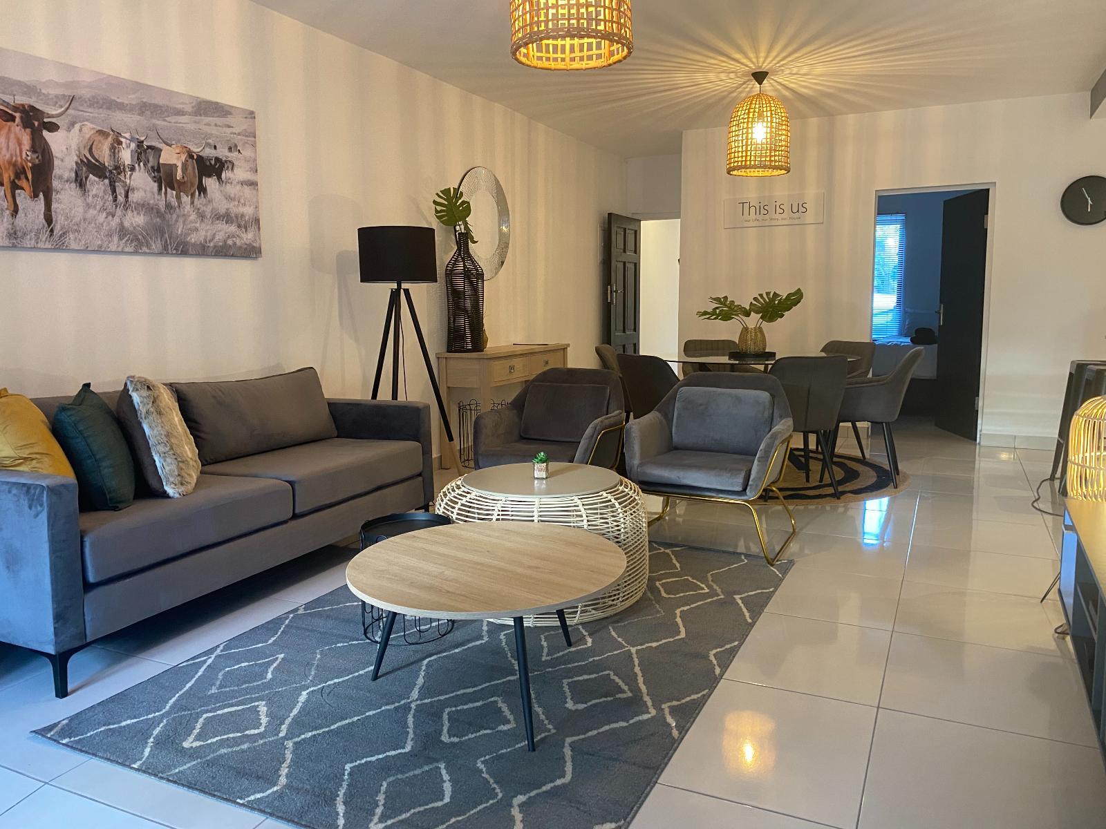 Prepare delicious meals with ease in the well-equipped kitchen, complete with a stove boasting a steam fan, fridge-freezer, kettle, toaster, microwave, washing machine, tumble dryer, and a sleek granite counter. A stylish dining area awaits, featuring a tasteful table for six and a chest of drawers, adding a touch of sophistication. Unwind in the inviting lounge, where you can enjoy the cool comfort of air-conditioning, sink into the plushness of an L-shaped lounge set, and indulge in top-notch entertainment with the flat-screen television featuring selected DStv channels.