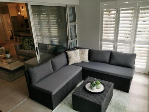 As you step into the living area, a world of serenity awaits through a sliding door, leading you to a private porch adorned with charming privacy shutters. Here, you'll find yet another comfortable L-shaped couch, accompanied by a captivating coffee table offering a mesmerizing view of the estuary. With a gas grill at your disposal, you can savor delectable bites as you soak up the beauty that surrounds you. Keep an eye out for Harry, the friendly hippopotamus, who often graces the apartment porch with his presence. While a shared braai area is available with the neighboring unit, rest assured that you'll have your very own private braai area to revel in.
