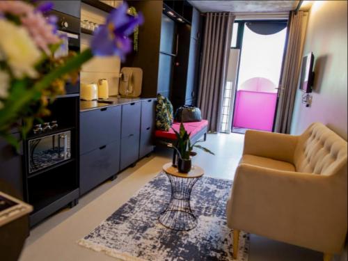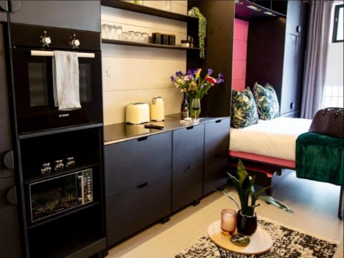Uxolo Studio 10 is a sophisticated urban retreat in the heart of Cape Town's City Centre. This micro-apartment offers a stylish sanctuary just steps from the vibrant dining and cultural hubs of Long and Kloof Streets. The building is an architectural landmark, blending high-end design with 24-hour security for a peaceful city stay.The interior features a sleek, minimalist layout designed to maximise space and comfort. A queen-size Murphy bed easily folds away to create a spacious lounge during the day, complemented by an integrated sliding desk for those working on the go. Large gl