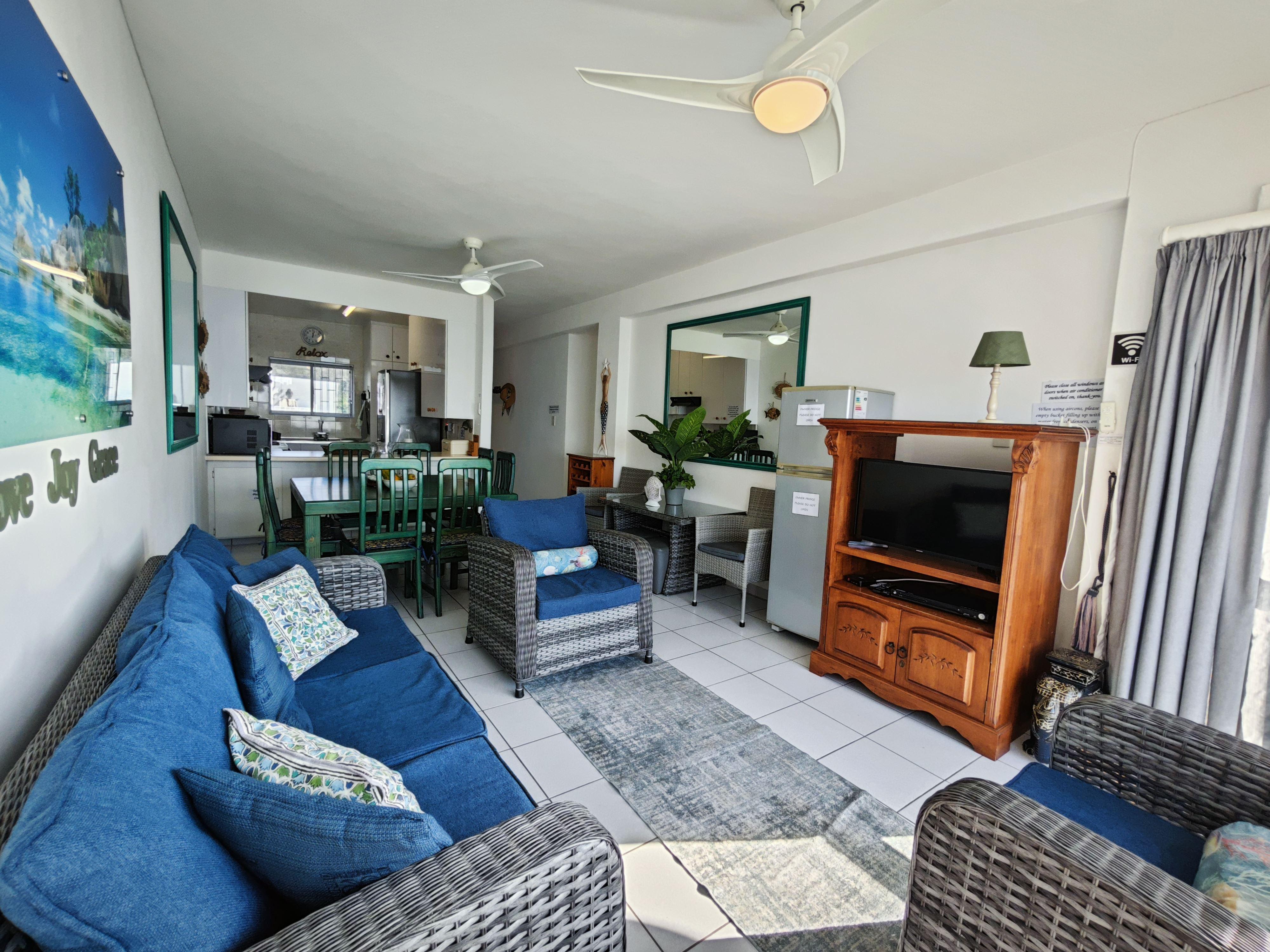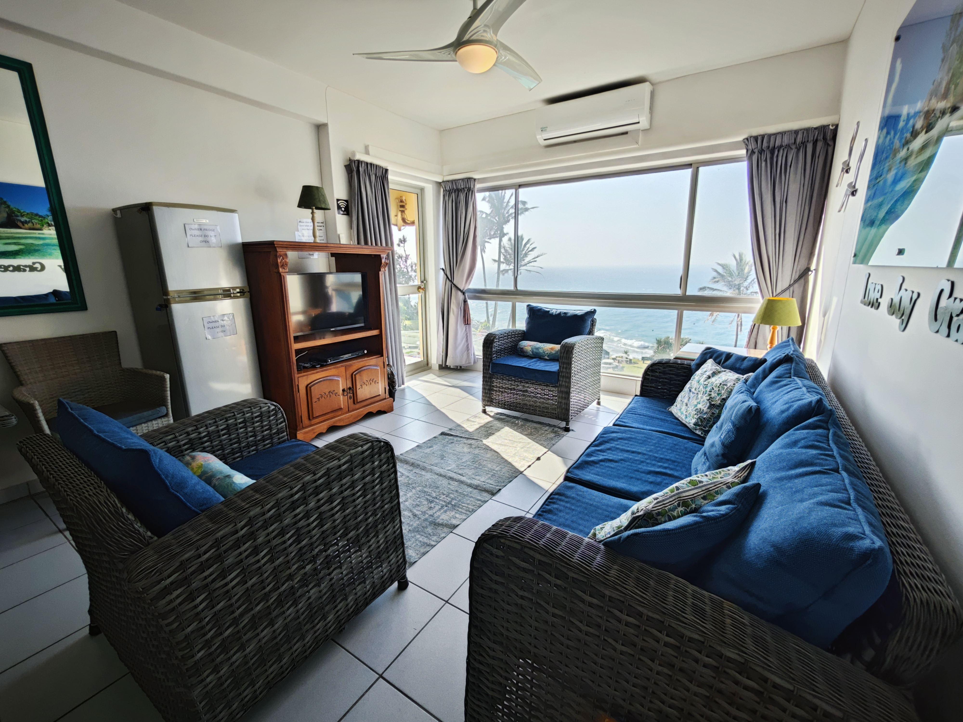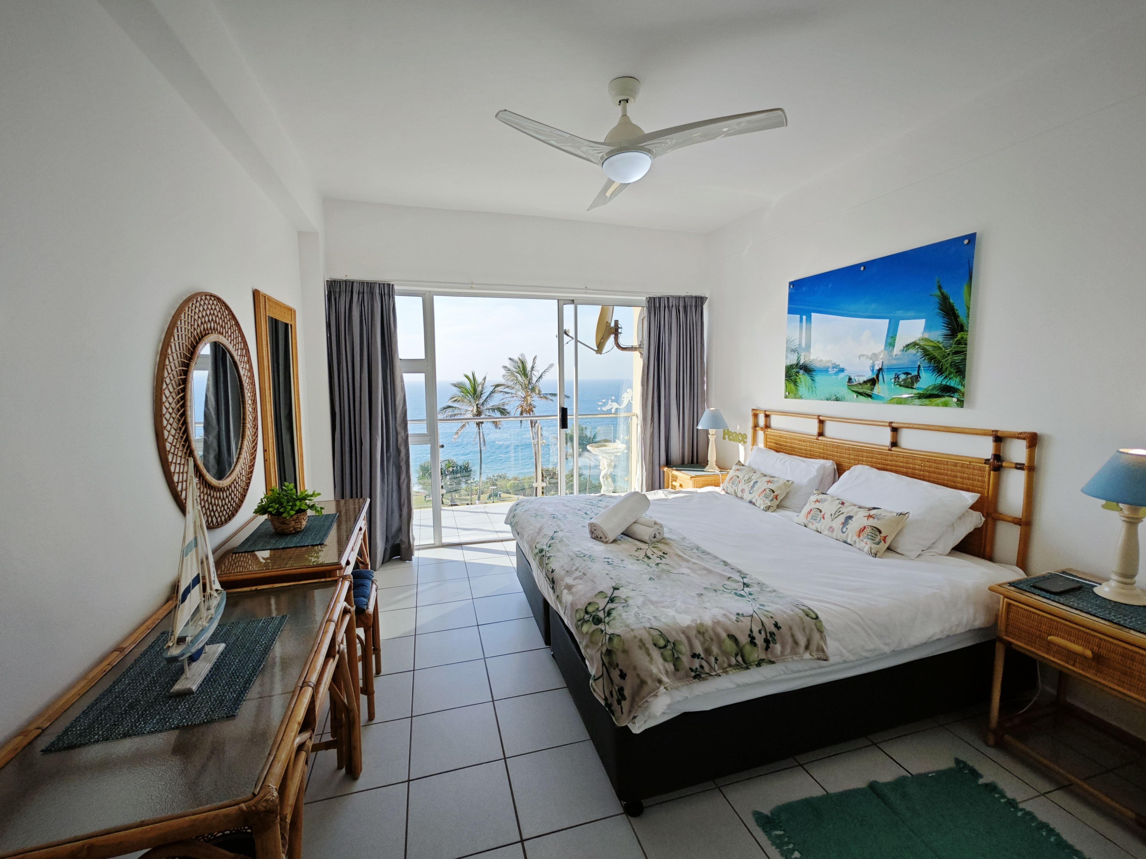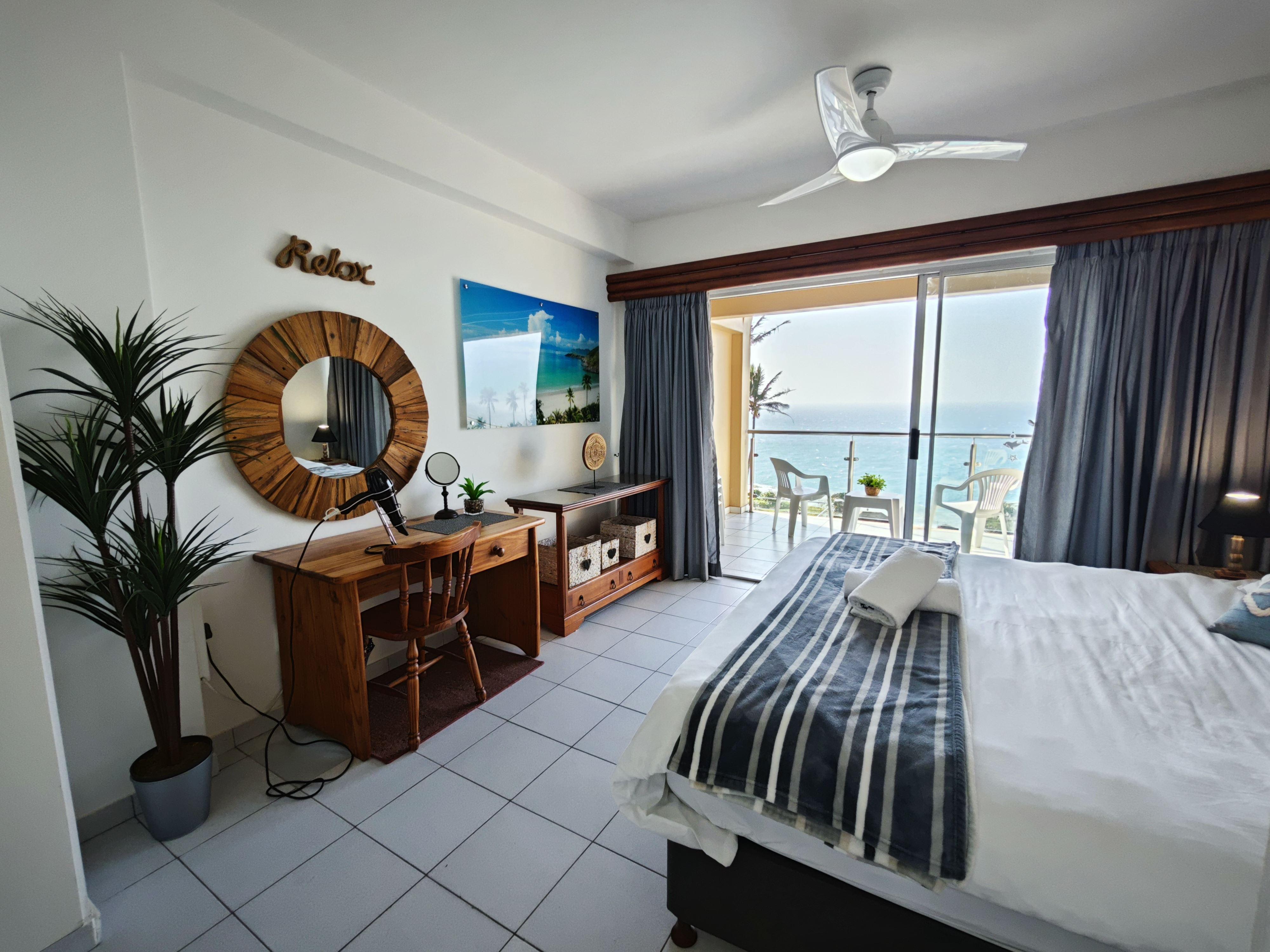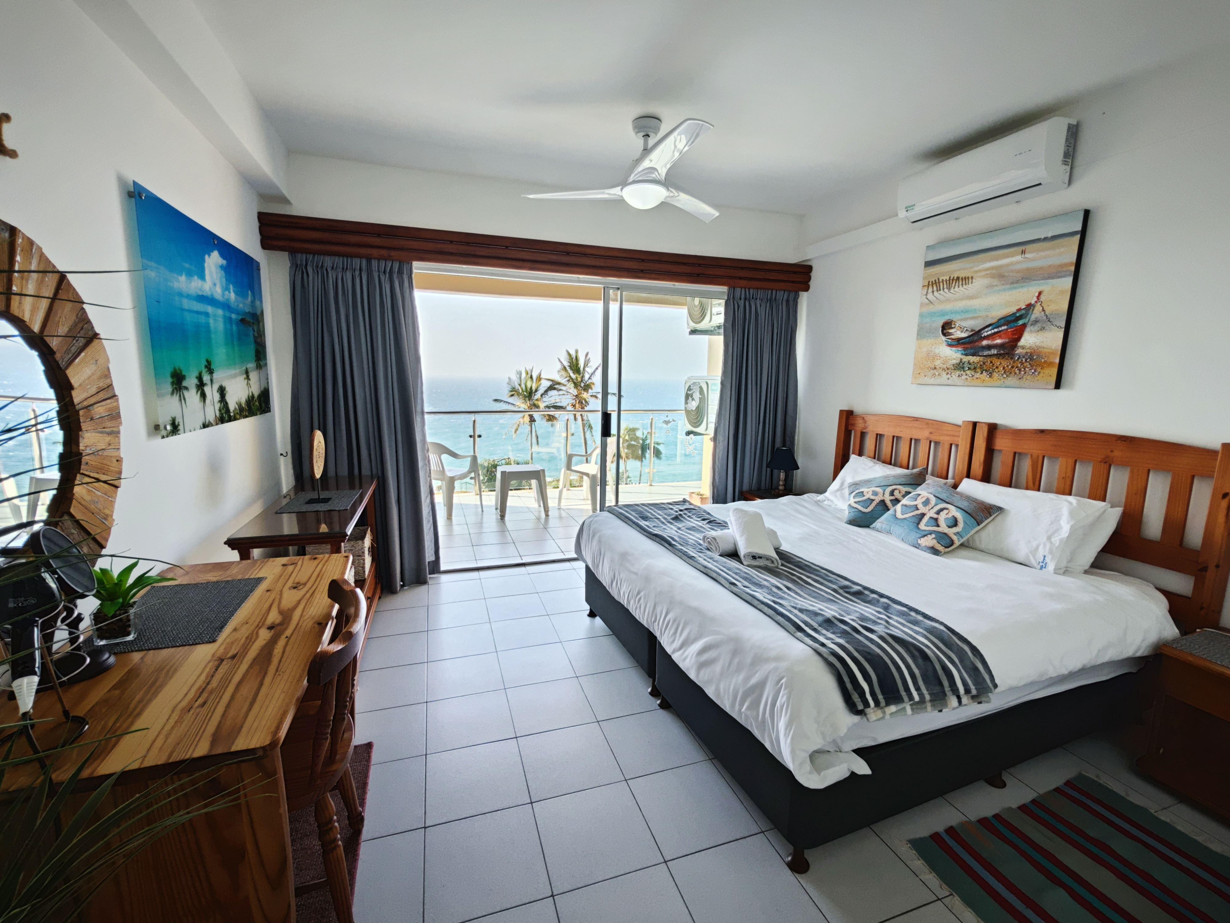 Villa Royale 710 is a beautiful three-bedroom, two-bathroom beachfront apartment. It can comfortably accommodate up to six guests. The bedrooms have one queen bed and one king bed and 2 single beds. The kitchen is equipped with all the necessities to see to your basic self-catering needs. There is air conditioning available in the main bedroom and lounge area. The apartment provides a dishwasher. DStv and Wi-Fi is available for entertainment purposes. The complex has a communal pool and braai area. Extremely steep walk down to the beach from pool area in complex, and an alternative