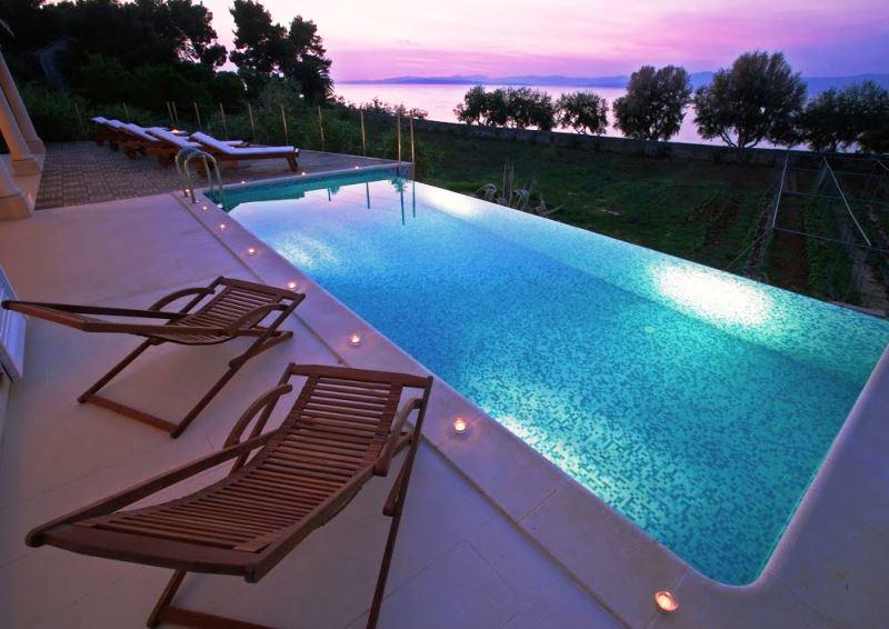 Villa Korina is situated in the peaceful village of Mirca, on the island of Brac and just 30 meters from the beach. The villa features large interior spaces with modern furniture, and the outdoor areas offer stunning views of the sea and the mainland.The villa consists of a main house and a guest annex which are connected with porches and terraces. The main house consists of four bedrooms with en-suite bathrooms, a laundry area, a spacious living area and a fully equipped kitchen. The guest annex has one bedroom, two bathrooms, a smaller kitchen and a living area with a double s