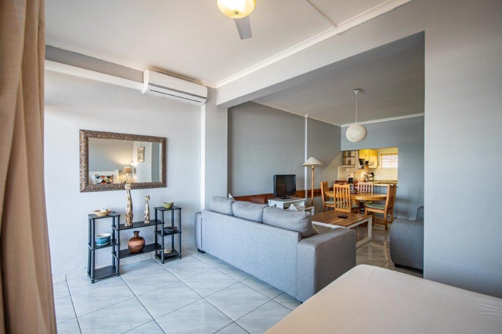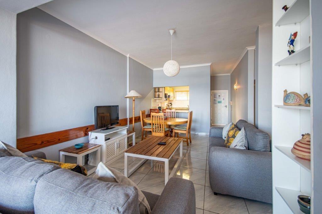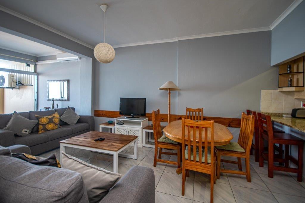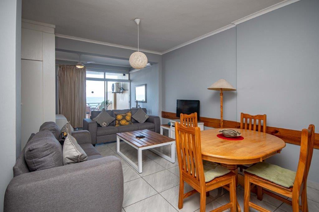 The second-floor apartment comprises of one bedroom, a fully equipped kitchen, a lounge with television and an additional bed, a four-seater dining table, and a balcony with ocean views. The complex offers guests the use of a communal swimming pool and braai facilities.