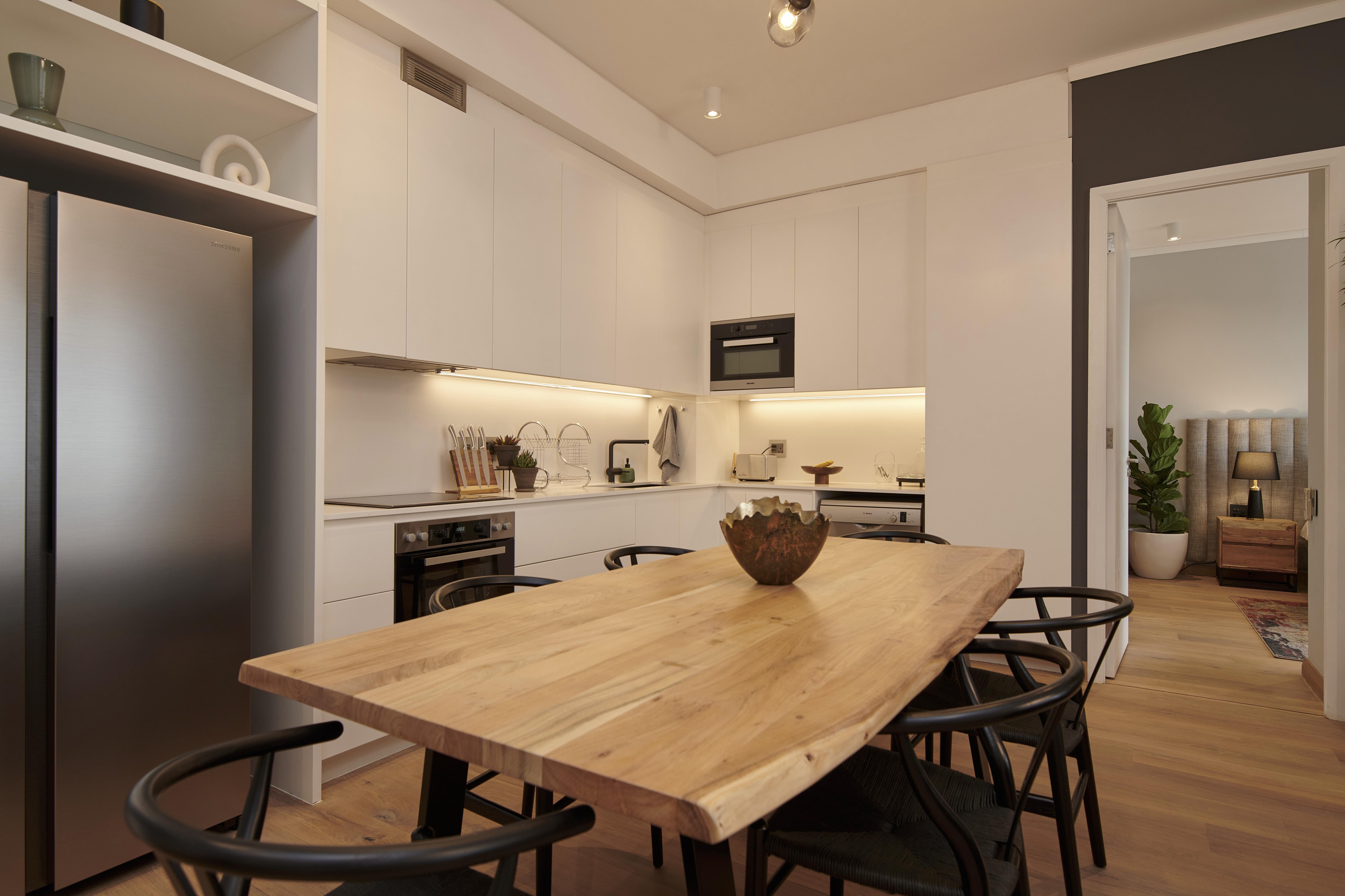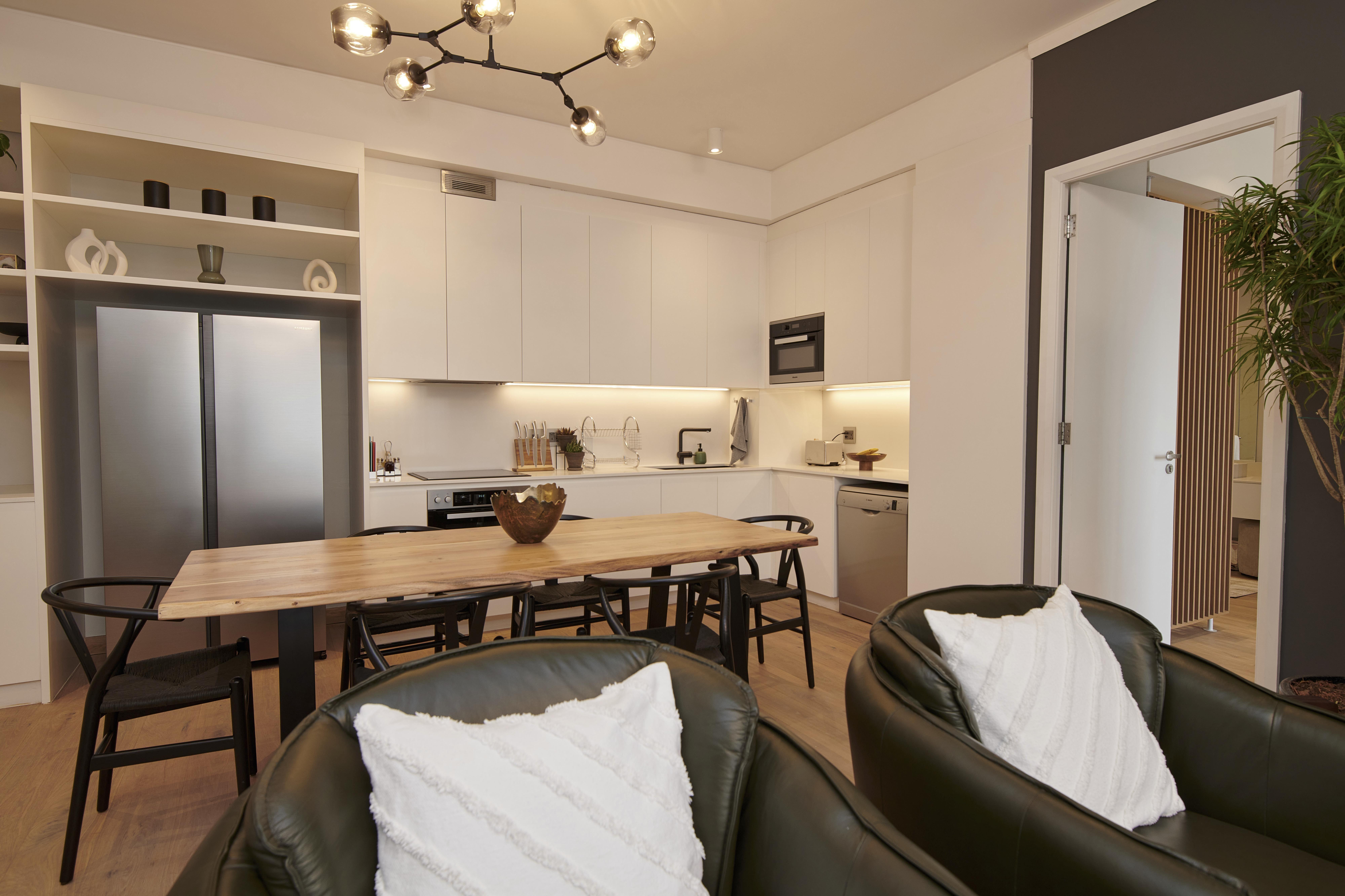 Open-plan dining table, lounge and kitchen