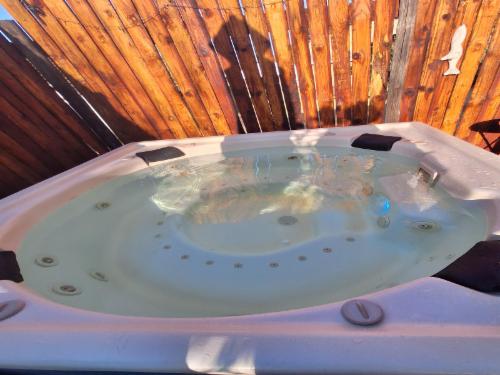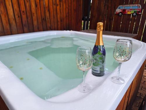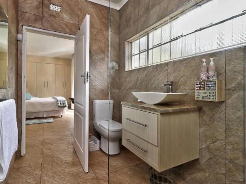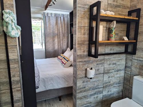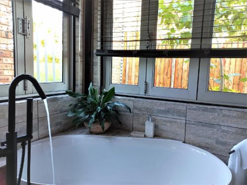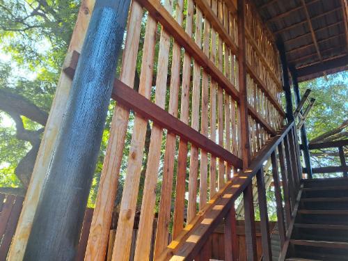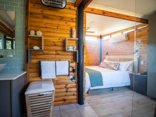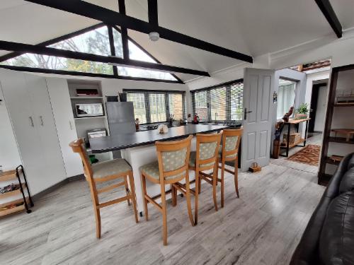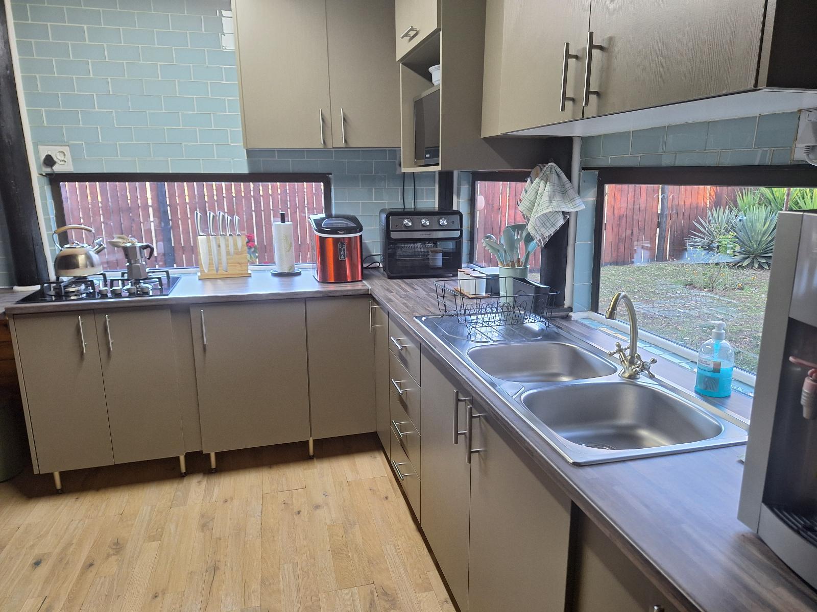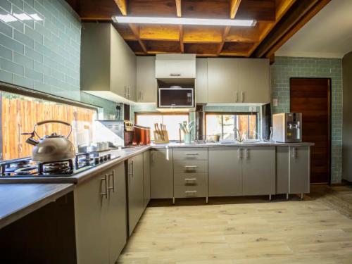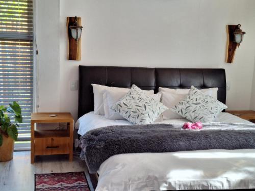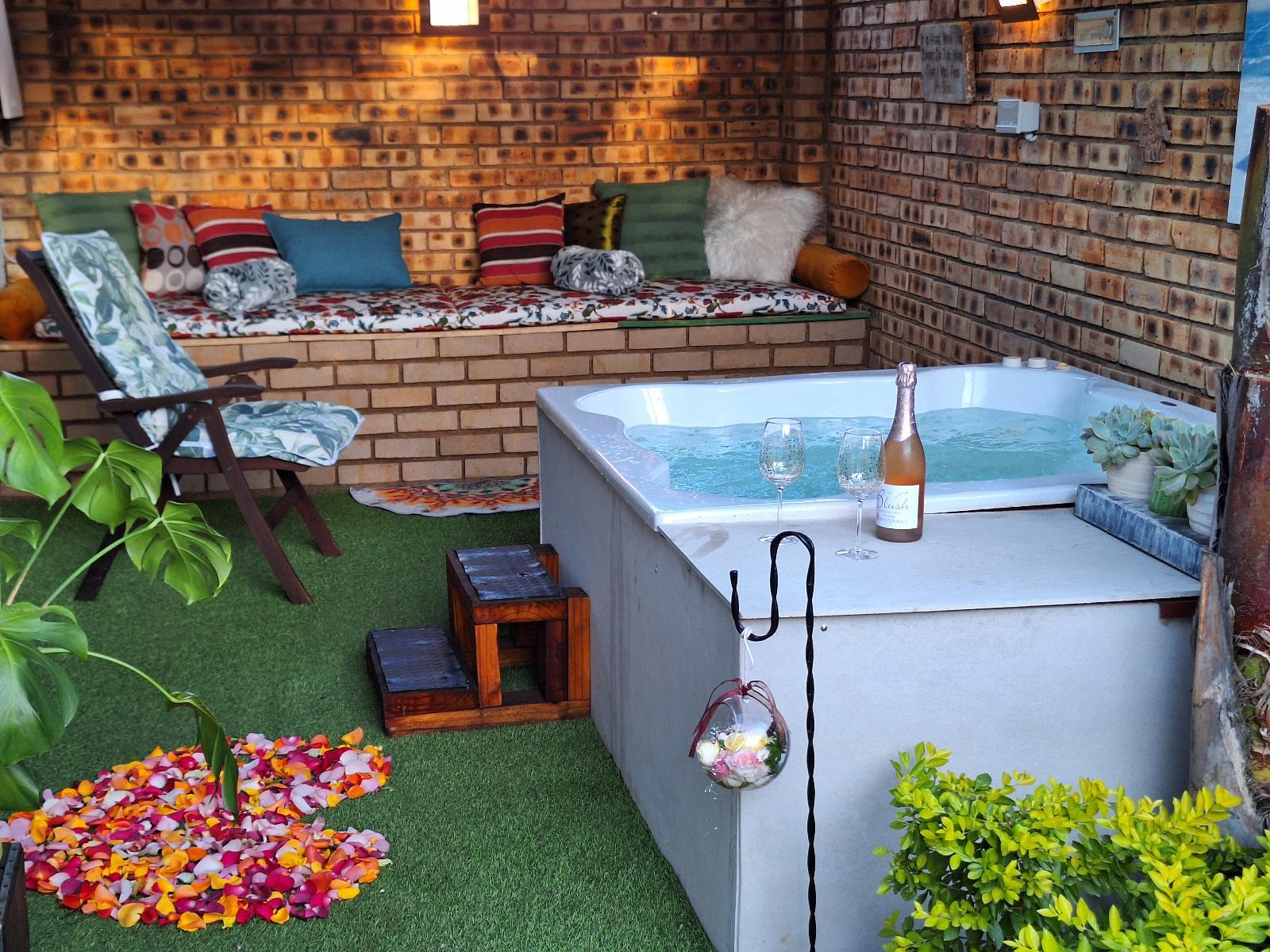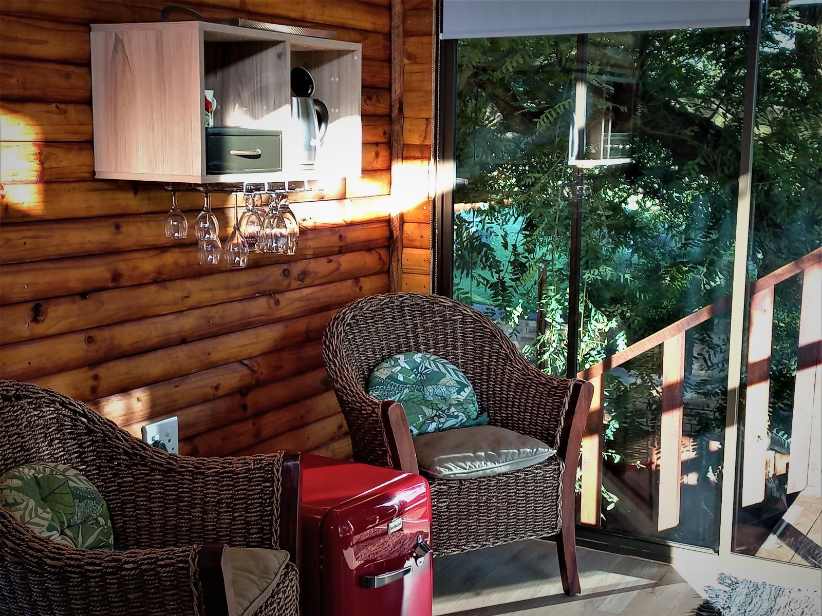 Downstairs is an open-plan living area with modern fittings including an H20 water purifier and ice-machine. The grill, rotisserie, airfryer and 4-plate gas stove allow for preparation of meals. For entertainment, there is a Smart TV which can access a variety of movies and programmes. The private and spacious deck has its own braai and the private lapa leads onto the secluded Jacuzzi courtyard. The Nest enjoys prolific bird life and you may be fortunate to see the visiting kingfishers and hear the spotted eagle owl.