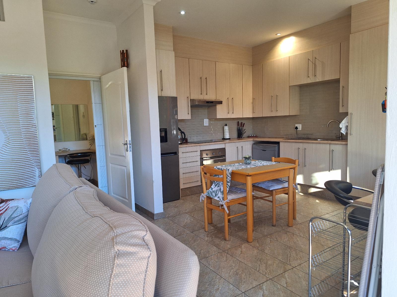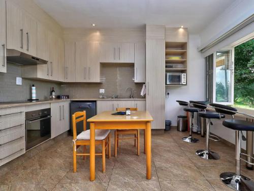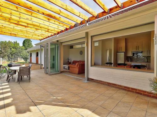 A modern kitchen provides the necessary amenities including a dishwasher, microwave, stove, oven, fridge-freezer and ice-machine. Condiments available for your use and tea, coffee, milk and bottled water are provided daily. Enjoy the private back courtyard and front braai and deck area under a private pergola with views of the paddocks.