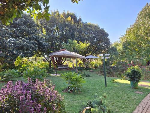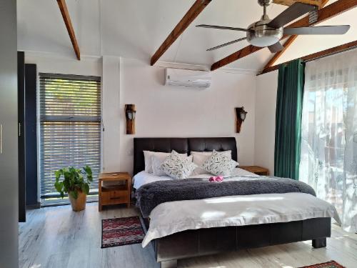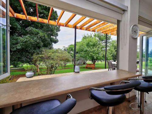 It offers beautiful views of the Paardekraal Pass and looks out over a pecan nut orchard, paddocks and the manicured gardens. Upstairs is an airy queen-size bedroom with a dressing room and coffee lounge. The en-suite bathroom has a double shower which is tiled to resemble a mountainside. An air-conditioner upstairs keeps the temperature ambient and the infrared heater and towel-warming rack ensures your comfort.