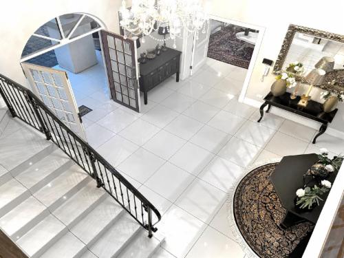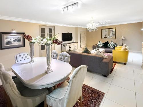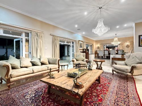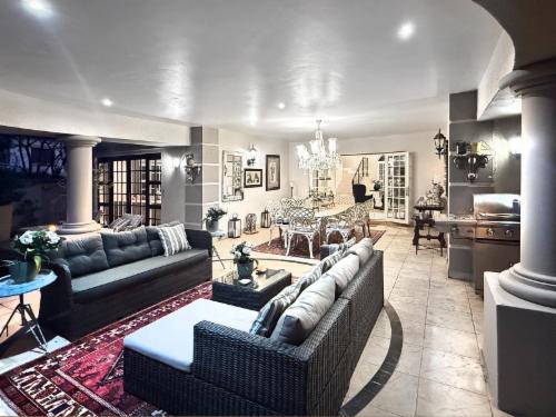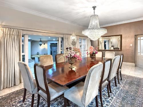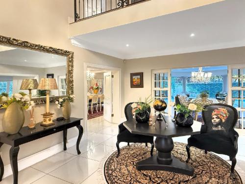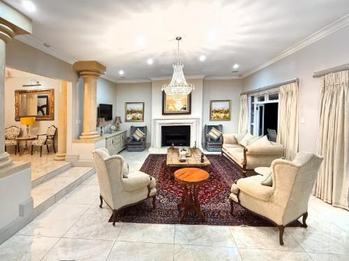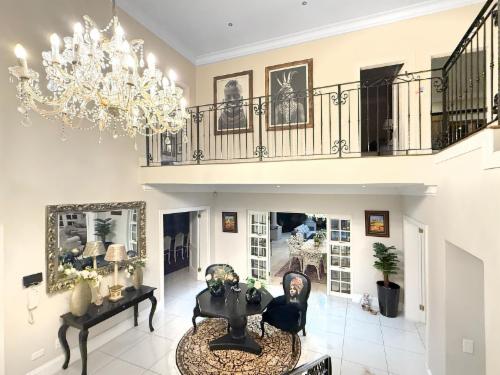Welcome to an exquisitely styled, 6-bedroom, 5.5-bath luxury home nestled in the exclusive Hyde Park, Sandton. Be greeted by a stunning double-sided Koi pond entrance and a captivating crystal chandelier in the grand foyer.