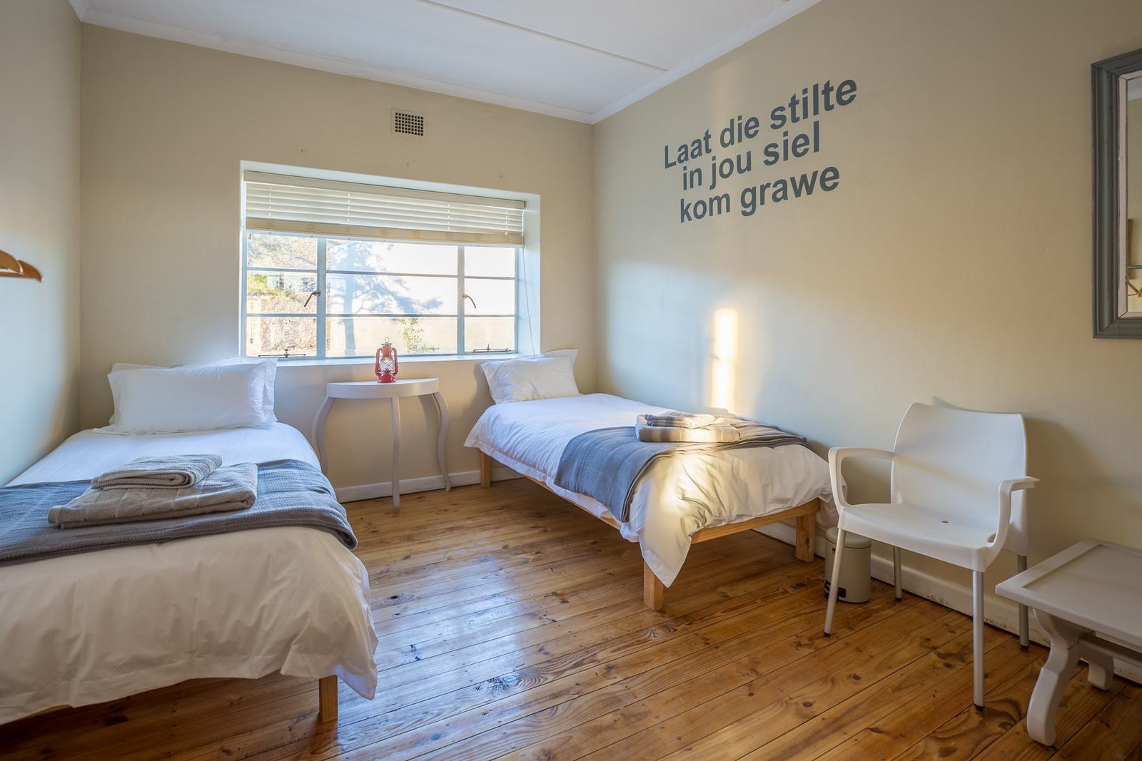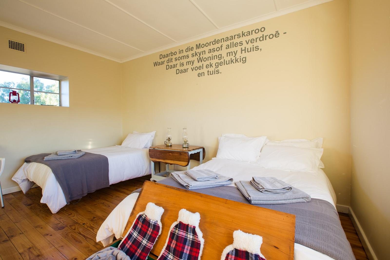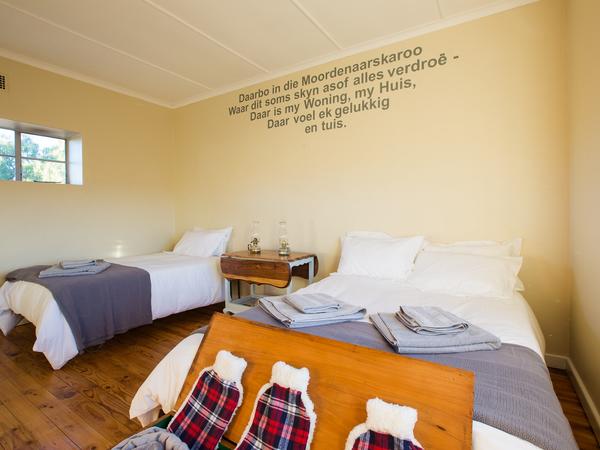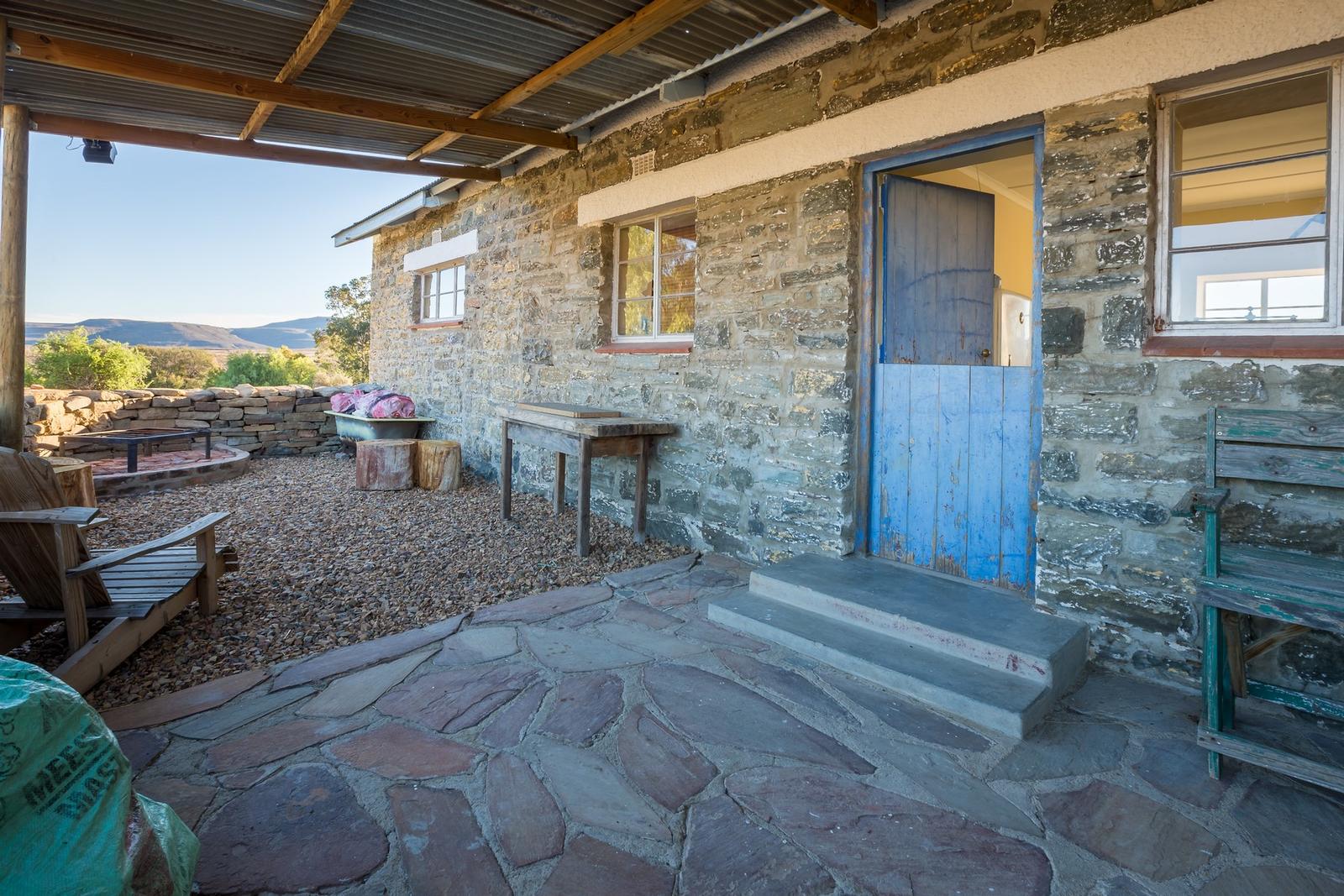 Brinksfontein is a Guest House, situated 60 kilometres from Sutherland, in the tranquillity of the Karoo, on a gravel road. Brinksfontein is the perfect place to kick off your shoes and recharge your batteries.Our accommodation is offered in a fully self-catering cottage. The cottage was built on the slopes of the Kurds Karoo's rocky outcrops. The charming unit has no electricity and no cell phone reception and is ideal for guests who are conscious of the environment.The cottage has three bedrooms and two bathrooms. The first bedroom has two single beds and a baby cot c